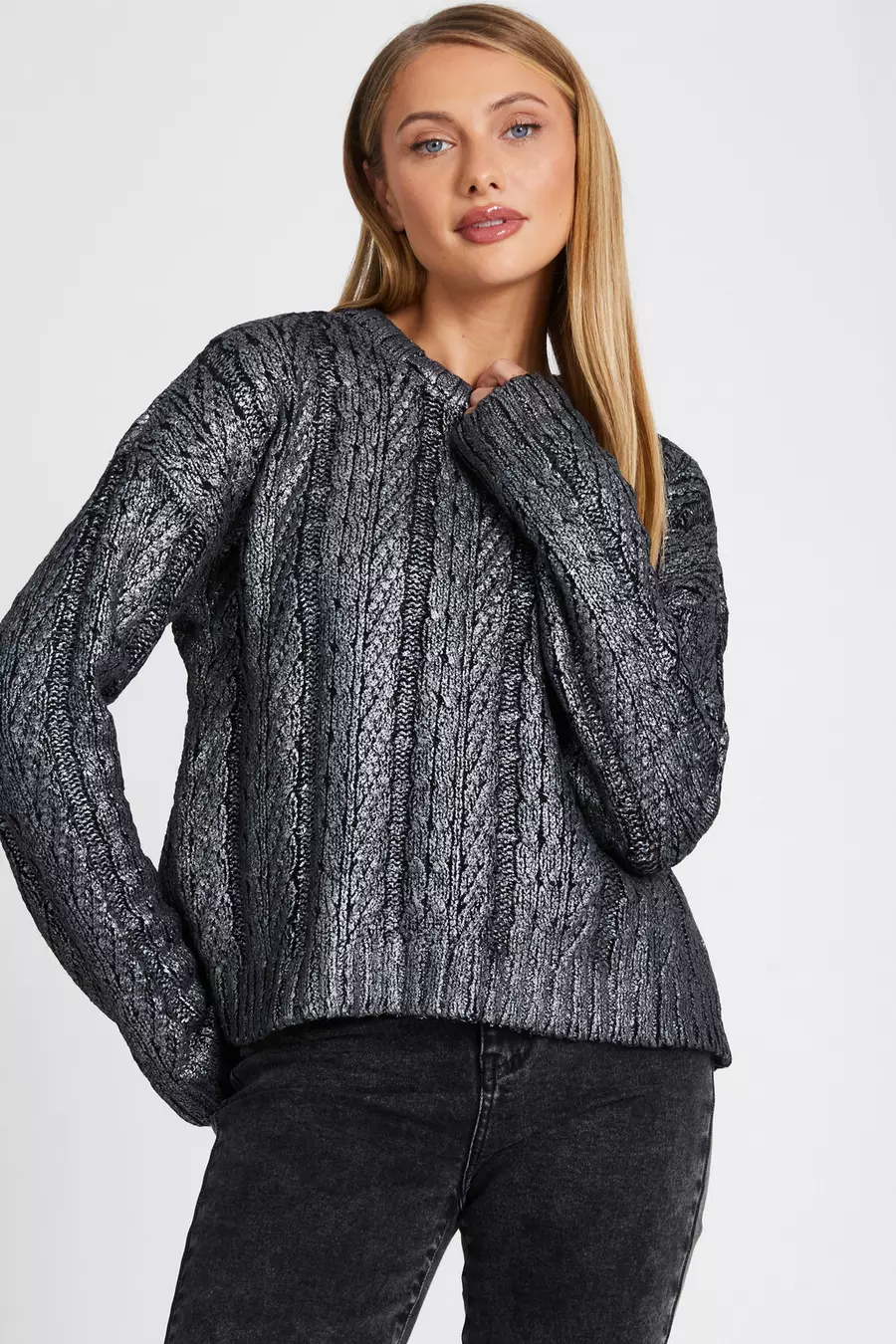 Black Metallic Cable Knit Jumper QUIZ Clothing