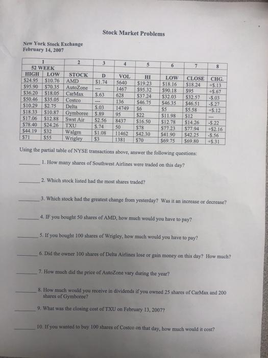 Solved Stock Market Problems New York Stock Exchange October Chegg