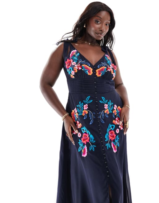 Plus embroidered dress deals, Hope Ivy Plus tie shoulder embroidered midi dress in navy ASOS deals
