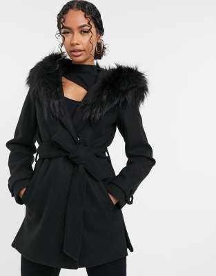 River Island Short Robe Jacket With Faux Fur Hood In Black ModeSens