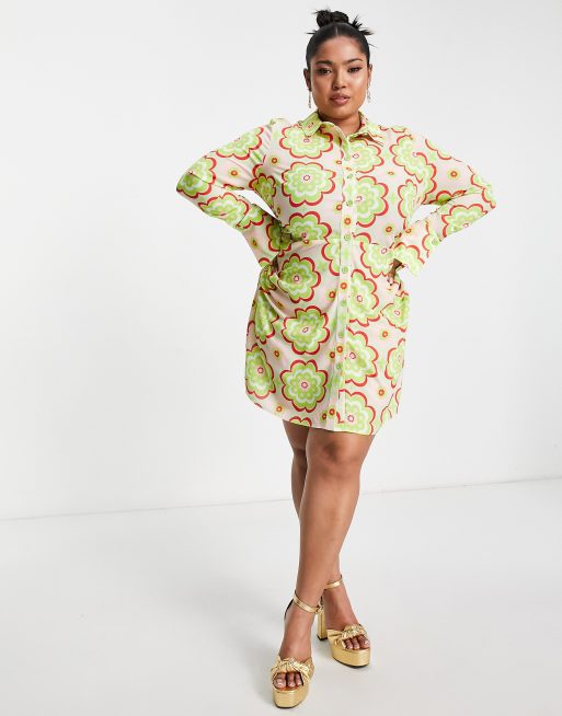 ASOS DESIGN Curve fitted mini shirt dress in pink retro floral print
