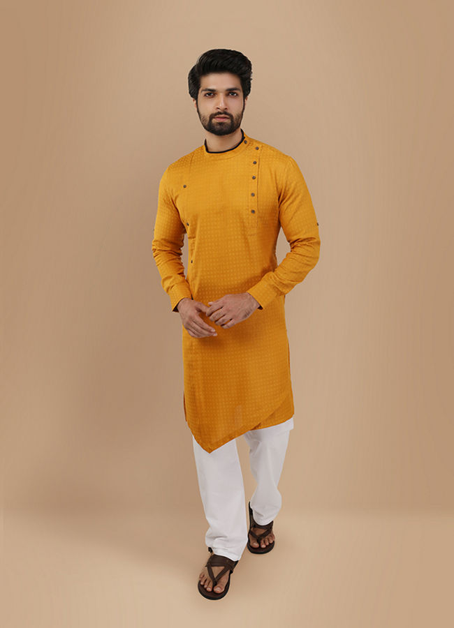 Buy Mustard Yellow Self Design Asymmetrical Kurta Online in India Manyavar Kurta for Men