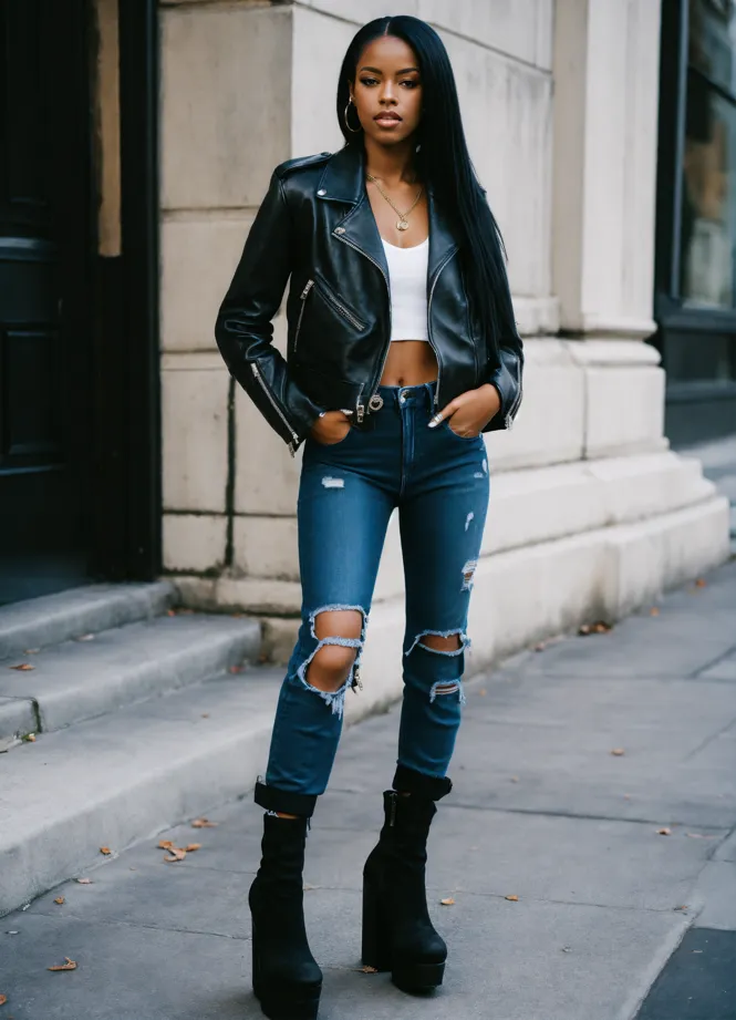 Black ripped jeans with denim jacket deals, Lexica wearing future black leather jacket with bikini under and blue jeans and red heels deals