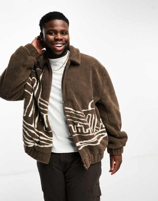 ASOS DESIGN oversized borg bomber jacket with scenic print in brown